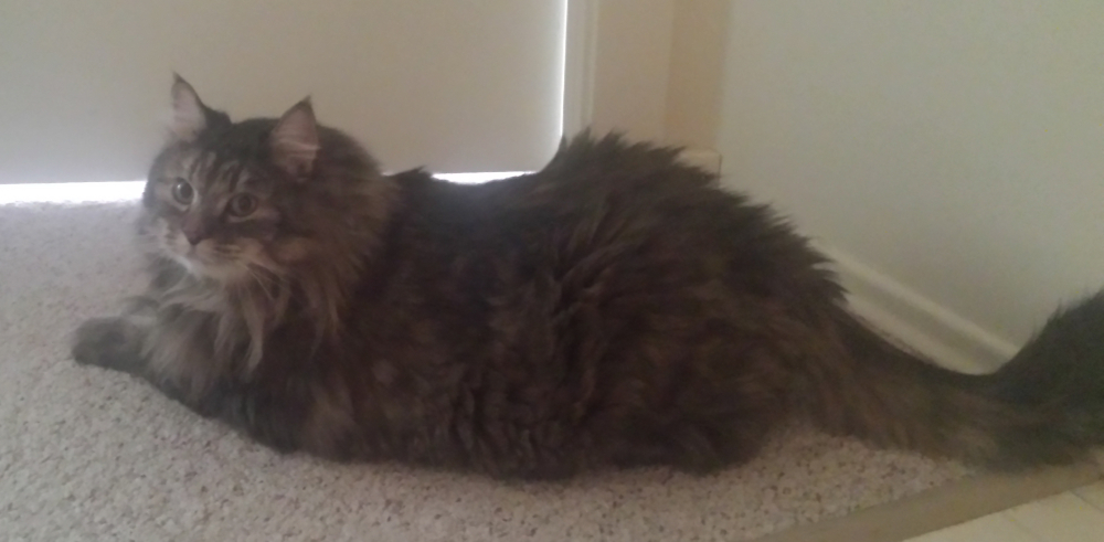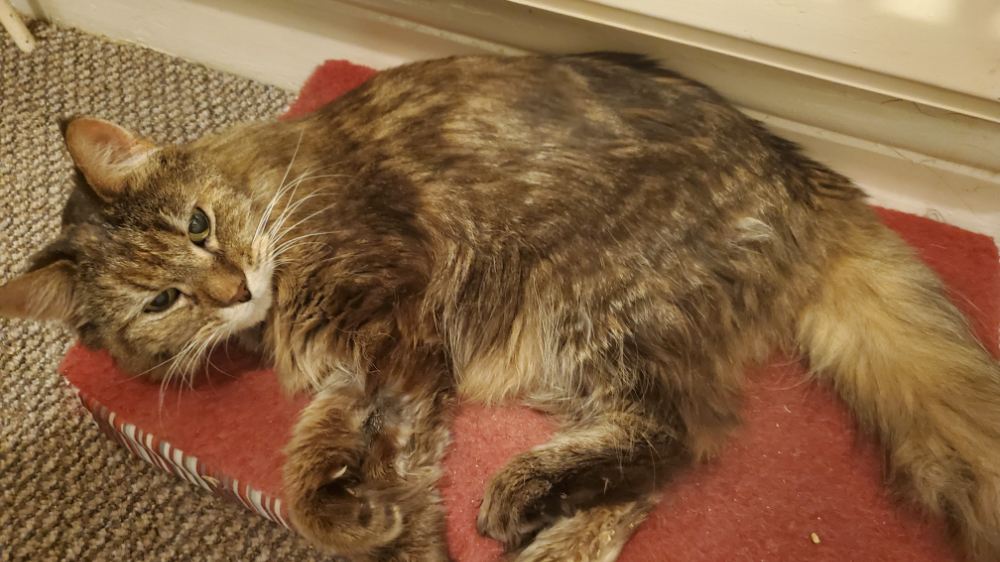 It took a while to brush the mats out of Pam’s coat; she’d only tolerate it for a few minutes at a time. At the vet’s recommendation, I put her on a diet to help her lose weight. She quickly became a minor celebrity among my family, friends, and coworkers.