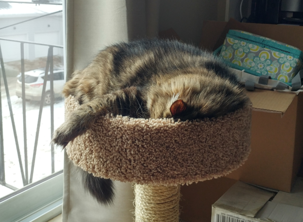 She didn’t sleep easy, at first. According to her paperwork, she’d been found alone on the streets in Grande Prairie and transferred to Edmonton after a prolonged stay at the shelter there. She probably wasn’t feral — no feral cat gets up to a weight of 9kg — but nobody came looking for her. Nobody wanted her. She hissed in her sleep and often woke up yowling; she was having nightmares.